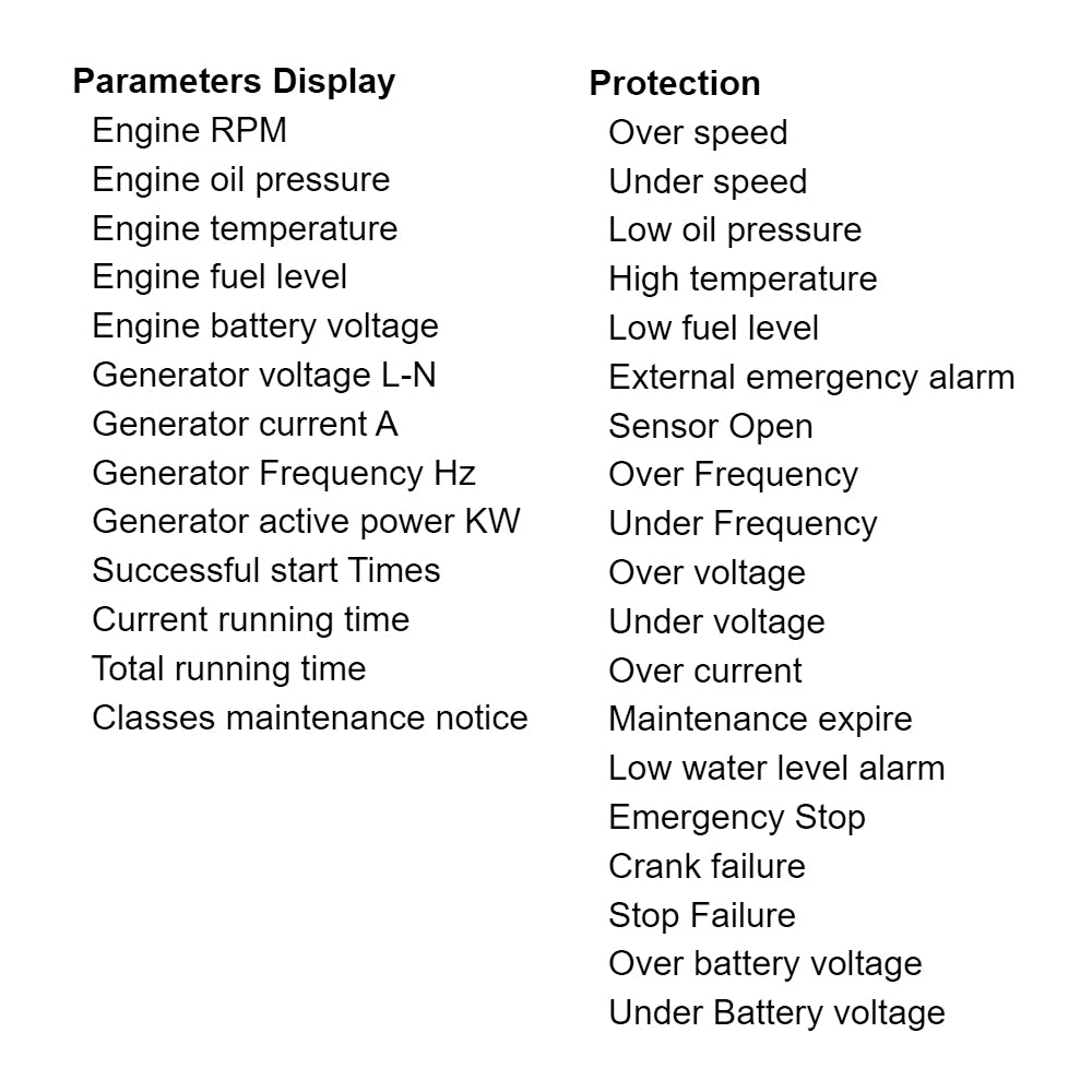 The controller has a point array LCD screen, can display various faults in the same time that the genset will be stopped once it can not work smoothly.