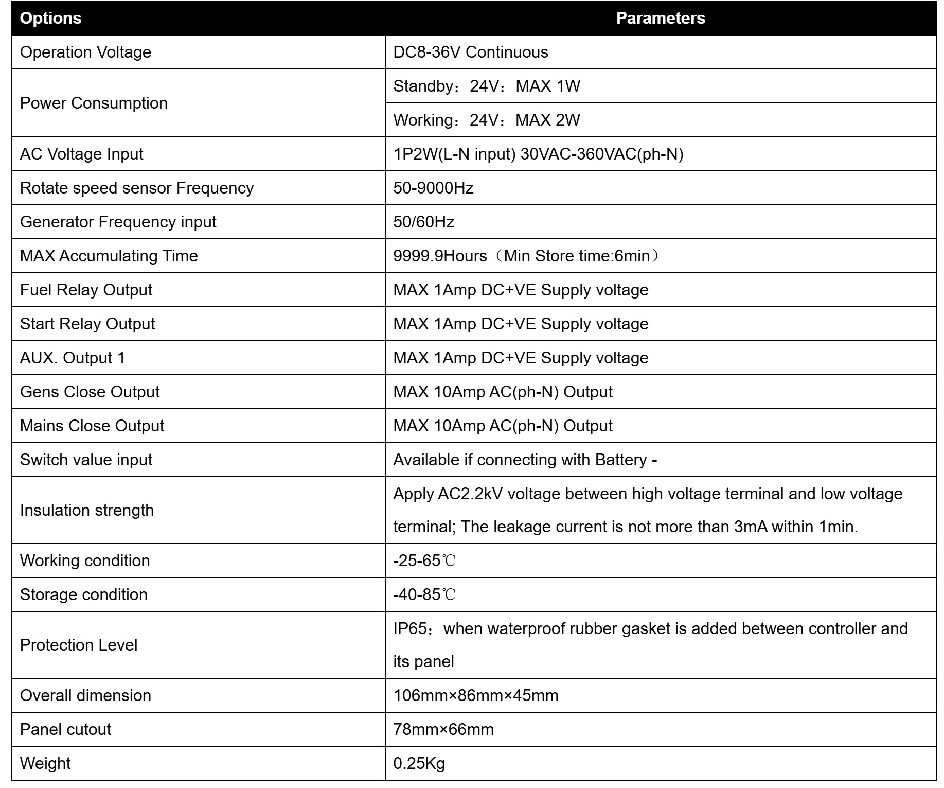 There are Chinese/English interface options, more language can be set according to user’s request. All the parameters can be configured through the front face buttons or use programmable interface by USB to adjust via PC. It can be widely applied for all kinds of auto control system of gensets.