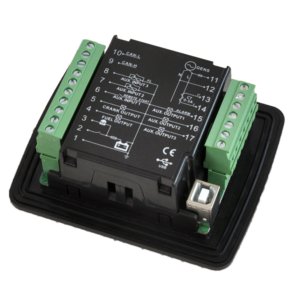 There are Chinese/English interface options, more language can be set according to user’s request. All the parameters can be configured through the front face buttons or use programmable interface by USB to adjust via PC. It can be widely applied for all kinds of auto control system of gensets.