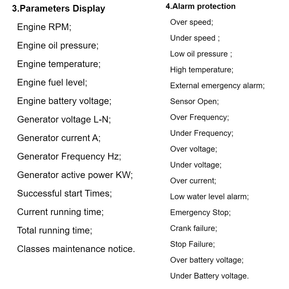 The controller has a point array LCD screen, can display various faults in the same time that the genset will be stopped once it can not work smoothly.