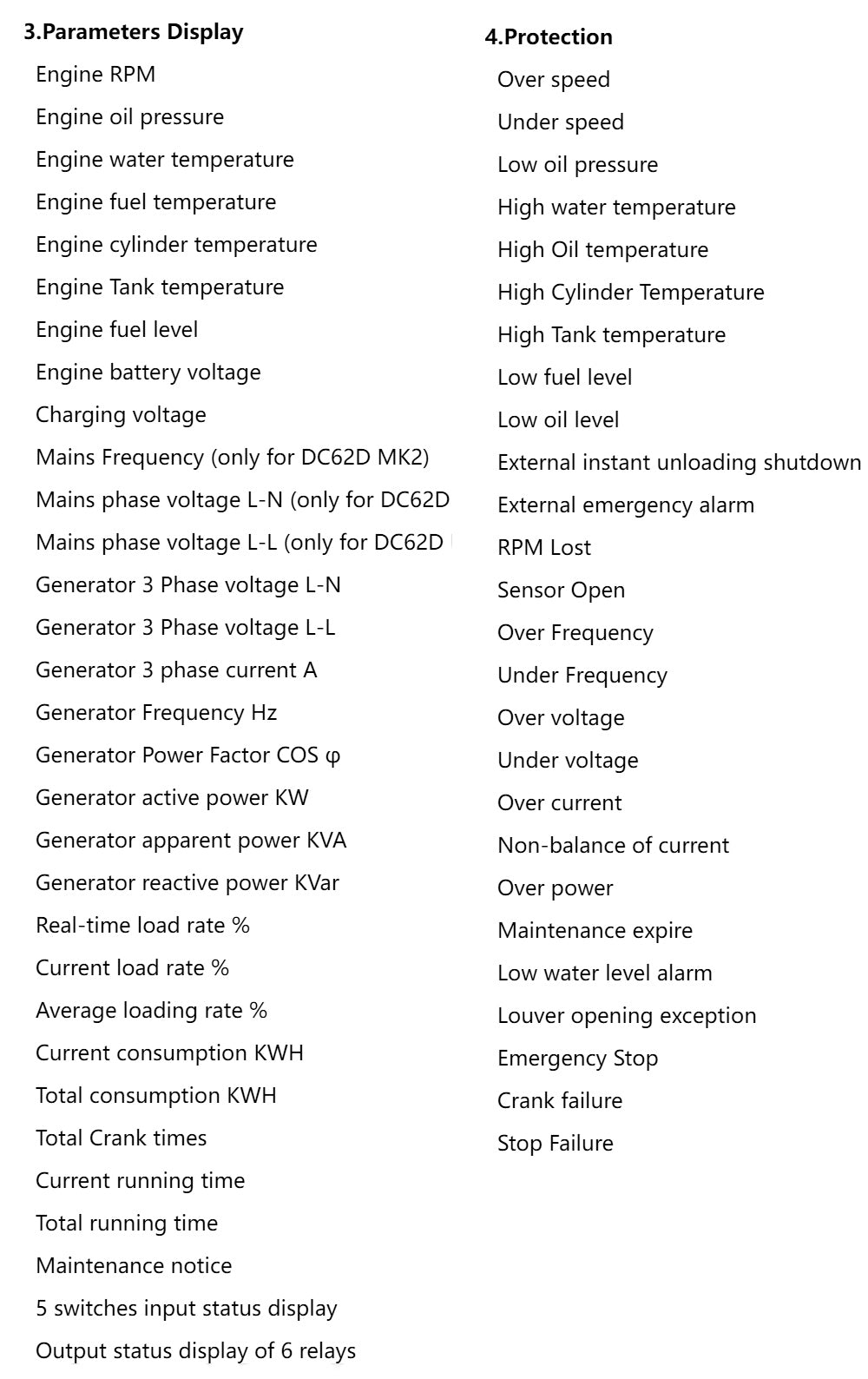DC62D MK2: Based on DC60D MK2, it adds Mains monitoring and AMF (Mains/Generator automatic switching control), especially suitable for the automation system composed by mains and genset.