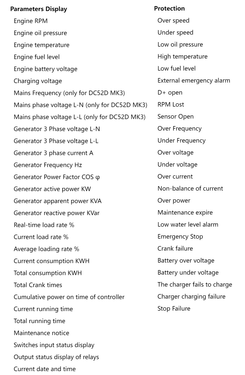 DC52D MK3: Based on DC50D MK3, it adds Mains monitoring and AMF (Mains/Generator automatic switching control), especially suitable for the automation system composed by mains and genset.