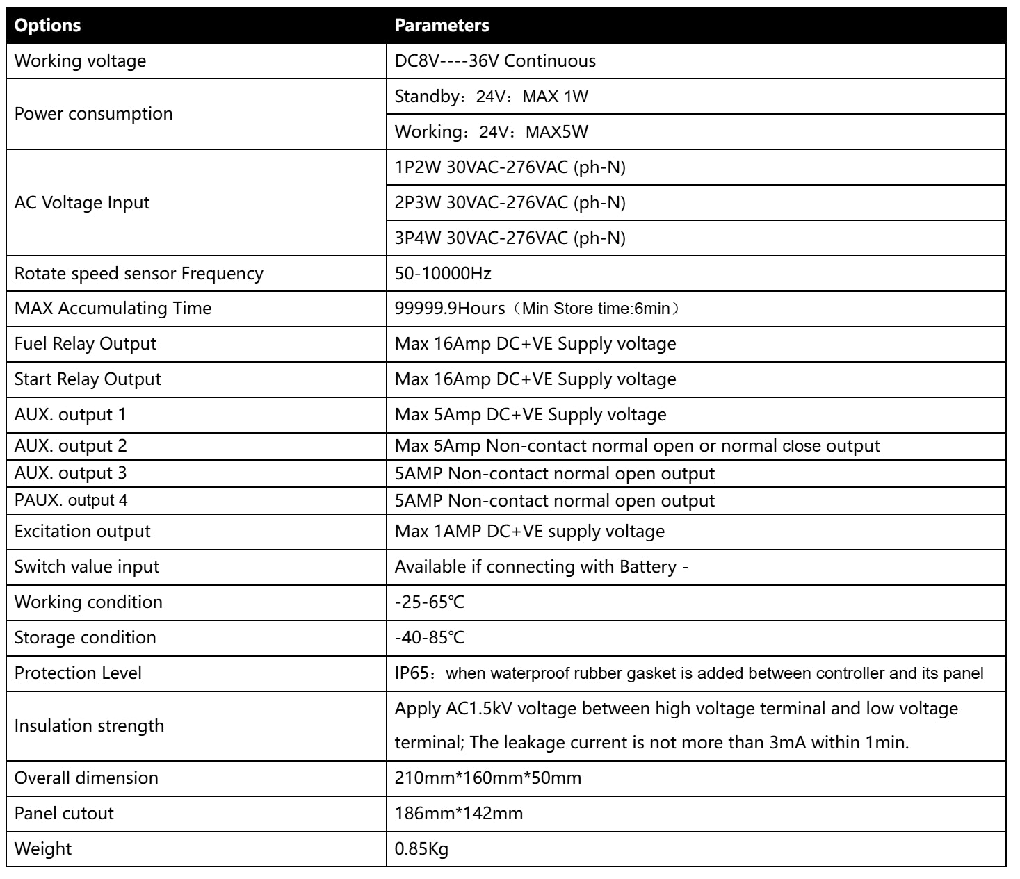 There are Chinese/English interface options, more language can be set according to user’s request. All the parameters can be configured through the front face buttons or use programmable interface by RS485 or USB to adjust via PC. It can be widely applied for all kinds of auto control system of gensets.