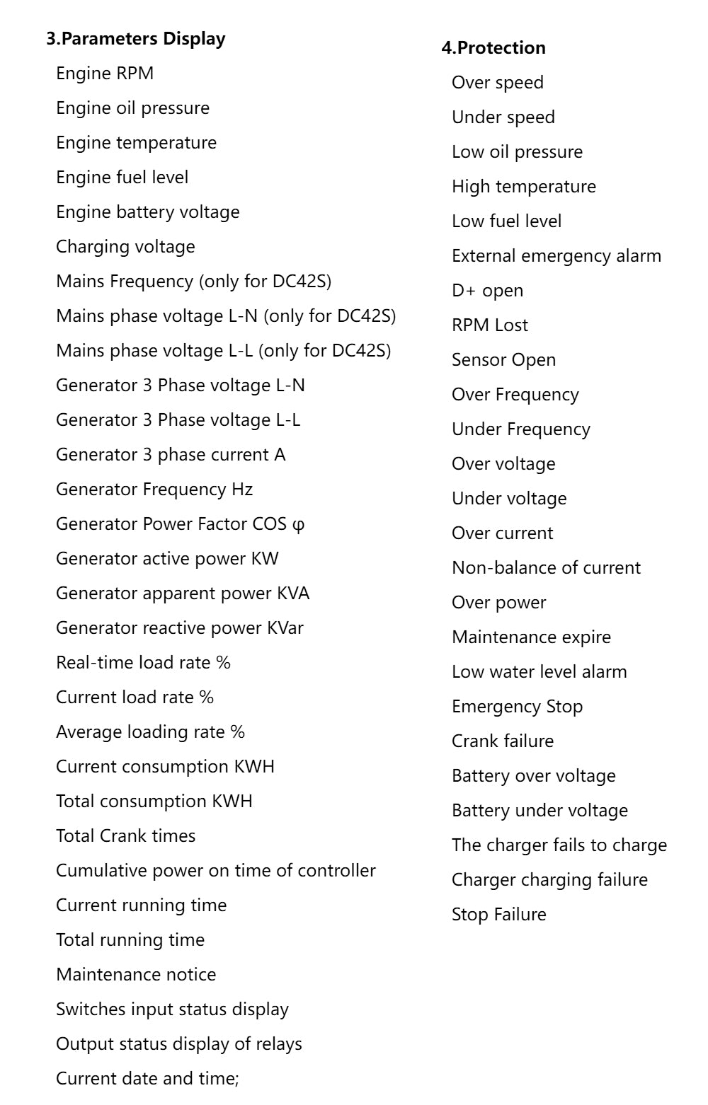 DC42S: Based on DC40S, it adds Mains monitoring and AMF (Mains/Generator automatic switching control), especially suitable for the automation system composed by mains and genset.