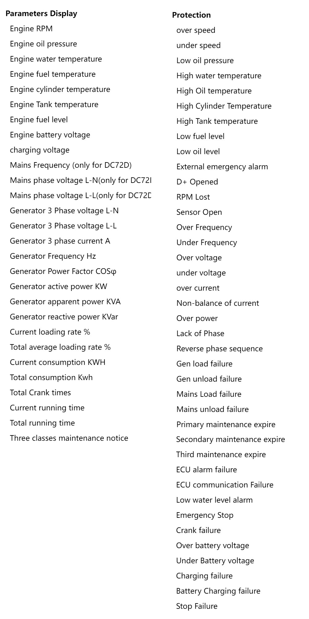 Control Protection: Auto Start/Stop of genset, load transfer (ATS control) and perfect failure display and protection.